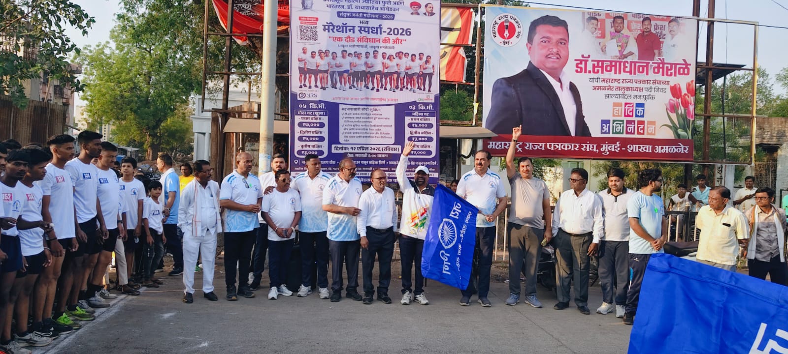 अमळनेर : क्रांतिसूर्य महात्मा फुले आणि भारतरत्न डॉ. बाबासाहेब आंबेडकर यांच्या संयुक्त जयंती महोत्सवानिमित्त अमळनेर शहरात आयोजित करण्यात आलेली भव्य मॅरेथॉन स्पर्धा उत्साहात आणि मोठ्या प्रतिसादात पार पडली. या स्पर्धेत शहरासह परिसरातील अनेक धावपटूंनी सहभाग घेत सामाजिक ऐक्य आणि निरोगी जीवनाचा संदेश दिला.
